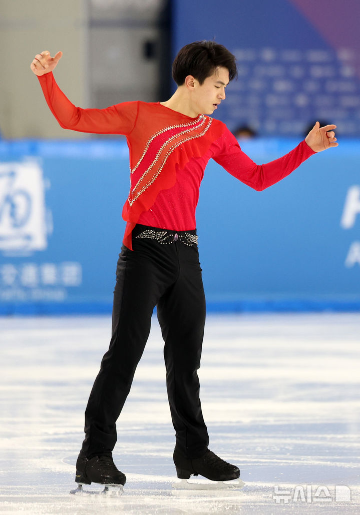 [하얼빈(중국)=뉴시스] 김선웅 기자 = 13일(현지 시간) 중국 하얼빈 헤이룽장 빙상훈련센터에서 열린 2025 하얼빈 동계 아시안게임 피겨스케이팅 남자 싱글 프리에 출전한 북한 로영명이 연기를 선보이고 있다. 2025.02.13. [email protected]
