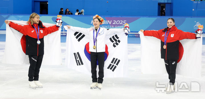 [하얼빈(중국)=뉴시스] 김선웅 기자 = 13일(현지 시간) 중국 하얼빈 헤이룽장 빙상훈련센터에서 열린 2025 하얼빈 동계 아시안게임 피겨스케이팅 여자 싱글 시상식에서 금메달을 수상한 김채연과 일본 선수들이 각각 태극기·일장기 세레머니를 하고 있다. 2025.02.13. [email protected]