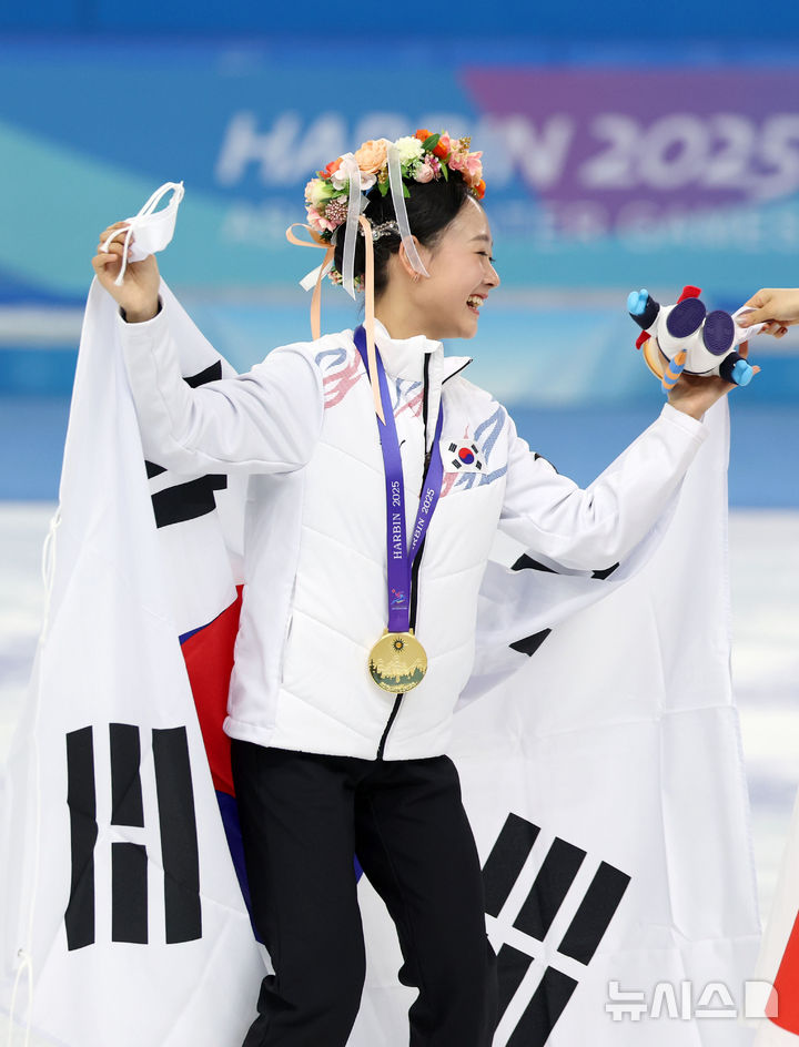 [하얼빈(중국)=뉴시스] 김선웅 기자 = 13일(현지 시간) 중국 하얼빈 헤이룽장 빙상훈련센터에서 열린 2025 하얼빈 동계 아시안게임 피겨스케이팅 여자 싱글 시상식에서 금메달을 수상한 김채연이 태극기 세레머니를 하고 있다.. 2025.02.13. [email protected]