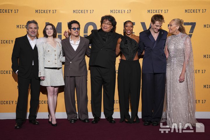 [런던=AP/뉴시스] 봉준호(가운데) 감독이 13일(현지 시간) 영국 런던에서 열린 영화 '미키 17' 월드 시사회에 참석해 출연진과 함께 포토 타임을 갖고 있다. 왼쪽부터 배우 마크 러팔로, 아나마리아 바르톨로메이, 스티븐 연, 봉 감독, 나오미 아키에, 로버트 패틴슨, 토니 콜렛. 2025.02.14.