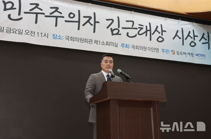 [서울=뉴시스] 권창회 기자 = 14일 오전 서울 여의도 국회 의원회관에서 열린 제9회 민주주의자 김근태상 시상식에서 전년도 수상자인 박정훈 해병대 대령이 인사말을 하고 있다. 2025.02.14. [email protected]