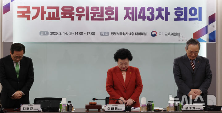 [서울=뉴시스] 김명원 기자 = 이배용 국가교육위원회 위원장과 위원들이 14일 서울 종로구 정부서울청사에서 열린 국가교육위원회 제43차 회의에 참석해 '대전 초등생 참사 피해자 고 김하늘 양을 추모하며 묵념을 하고 있다. 2025.02.14. [email protected]