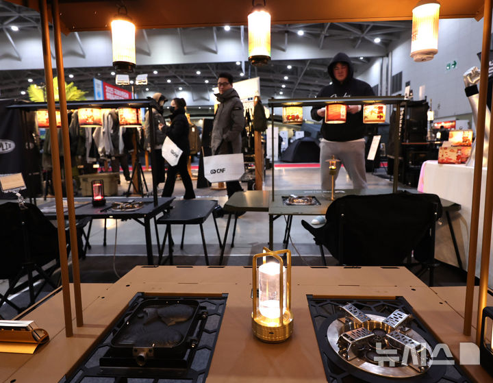 [인천=뉴시스] 전진환 기자 = 14일 오전 인천 연수구 송도컨벤시아에서 열린 2025 캠핑 & 레포츠 페스티벌을 찾은  관람객들이 캠핑용품을 살펴보고 있다.  2025.02.14. [email protected]
