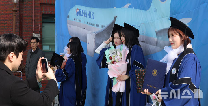 [인천=뉴시스] 전진환 기자 = 14일 오후 인천 미추홀구 인하공업전문대학에서 열린 학위수여식에서 한공운항과 졸업생들이 기념촬영을 하고 있다. 2025.02.14. [email protected]