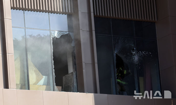 [부산=뉴시스] 하경민 기자 = 14일 오후 부산 기장군 반얀트리 복합리조트 신축공사장 화재 현장에서 소방대원이 건물 내 연기를 배출시키기 위해 유리창을 깨고 있다.