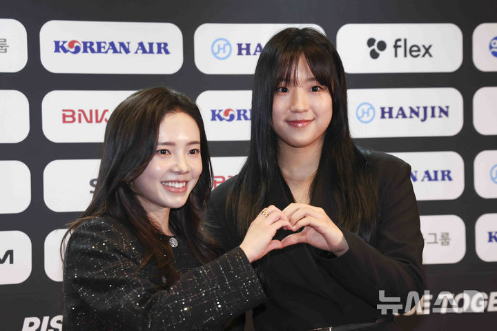 [서울=뉴시스] 김근수 기자 = 탁구선수 전지희와 신유빈이 14일 오후 서울 동대문구 JW메리어트 동대문스퀘어에서 열린 KTTA 어워즈 2025에서 포즈를 취하고 있다. 2025.02.14. [email protected]