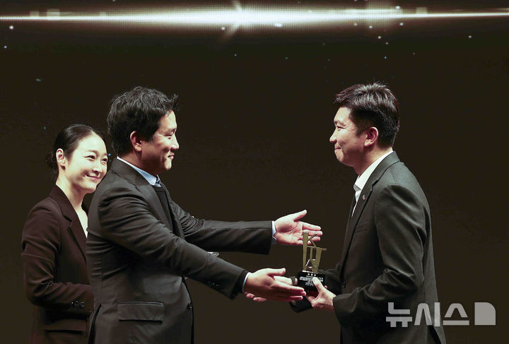 [서울=뉴시스] 김근수 기자 = 이태성(왼쪽) 대한탁구협회장이 14일 오후 서울 종로구 JW메리어트 동대문 스퀘어에서 열린 대한탁구협회(KTTA) 어워즈 2025에서 유승민 대한체육회장에게 특별상을 전달하고 있다. 2025.02.14. [email protected]