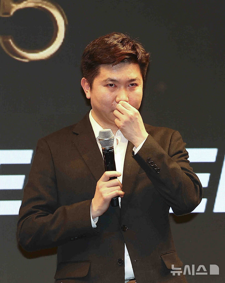[서울=뉴시스] 김근수 기자 = 유승민 대한체육회장이 14일 오후 서울 종로구 JW메리어트 동대문 스퀘어에서 열린 대한탁구협회(KTTA) 어워즈 2025에서 발언 도중 울컥하고 있다. 2025.02.14. [email protected]