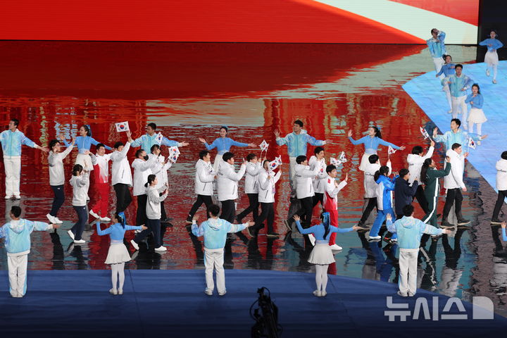 [하얼빈(중국)=뉴시스] 김선웅 기자 = 14일(현지 시간) 중국 하얼빈 국제 컨벤션 전시 스포츠센터에서 열린 2025 하얼빈 동계 아시안게임 폐회식에서 한국 선수단이 입장하고 있다. 2025.02.14. [email protected]