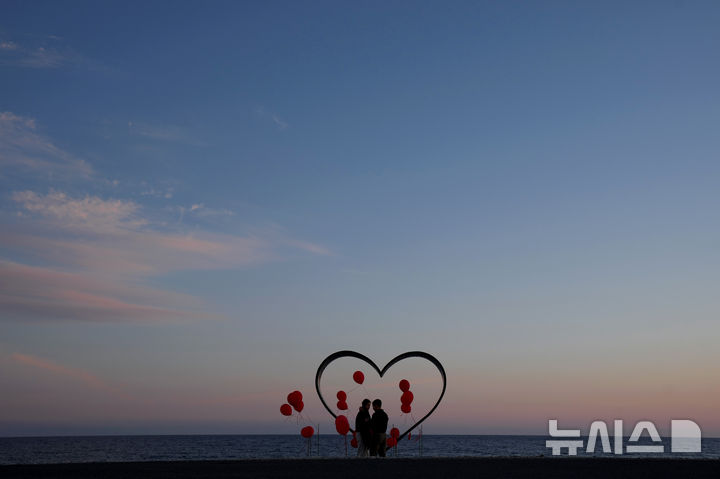 [라르나카=AP/뉴시스] 밸런타인데이인 14일(현지 시간) 키프로스 라르나카 지구 아기오스 테오도로스 마을 바다 전망대, 빨간 풍선으로 장식된 하트 앞에서 한 연인이 사랑을 약속하고 있다. 2025.02.14.
