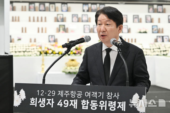[무안=뉴시스] 이영주 기자 = 권영진 12·29 제주항공 참사 국회특별위원장이 참사 49일째를 맞는 15일 전남 무안군 무안국제공항에서 열린 참사 49재 봉행에 참여해 추모사하고 있다. 2025.02.15. [email protected]