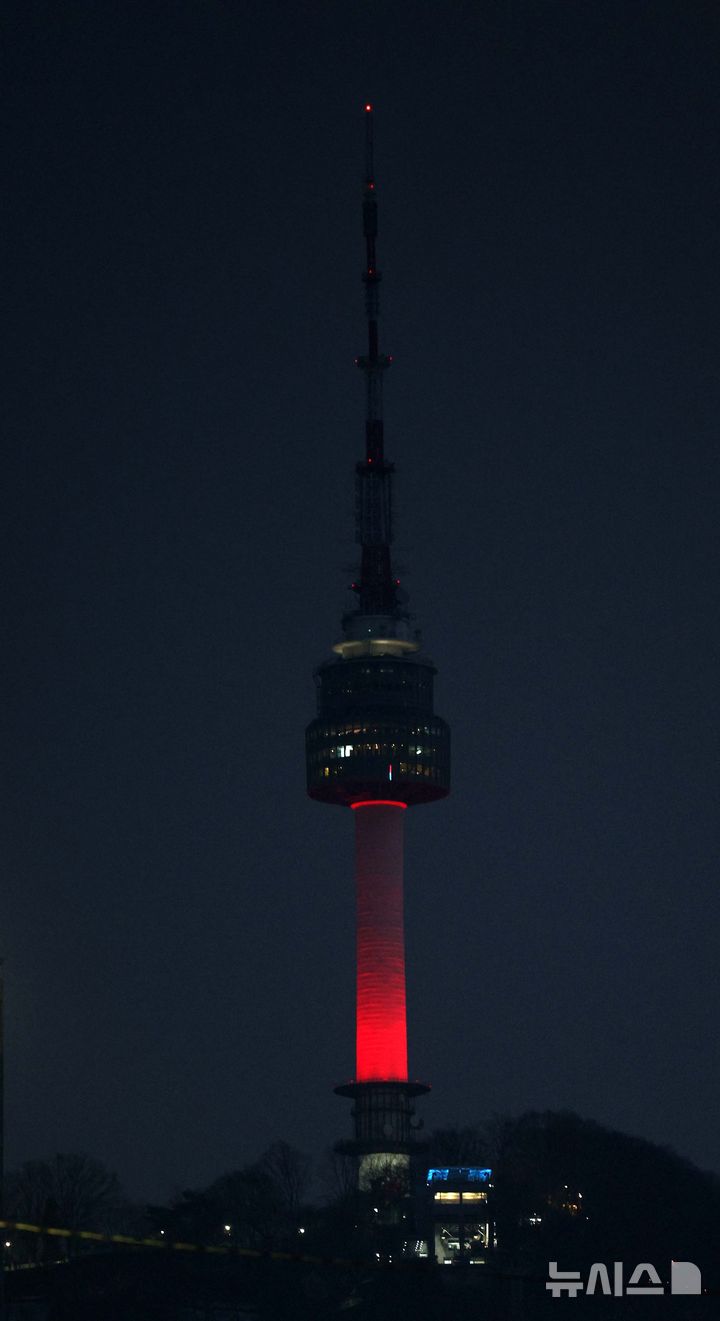 [서울=뉴시스] 고범준 기자 = 한일 국교정상화 60주년 기념 라이트업 행사가 열린 15일 오후 서울 용산구 남산서울타워에 파란색 불빛과 빨간색 불빛이 점등되고 있다. 2025.02.15. [email protected]