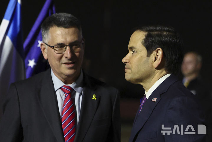 [텔아비브(이스라엘)=AP/뉴시스]이스라엘의 시작으로 아랍에미리트(UAE)와 사우디아라비아 등 중동 순방에 나선 마코 루비오 미 국무장관(오른쪽)이 15일(현지시각) 이스라엘 텔아비브에 도착해 기드온 사르 이스라엘 외무장관의 영접을 받고 있다. 2025.02.16.