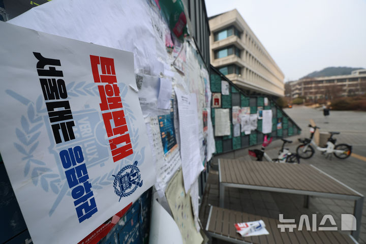 [서울=뉴시스] 김명년 기자 = 16일 오후 서울 관악구 서울대학교 중앙도서관 앞 게시판에 윤석열 대통령에 대한 탄핵 찬성 및 반대 대자보가 게시돼 있다. 2025.02.16. [email protected]