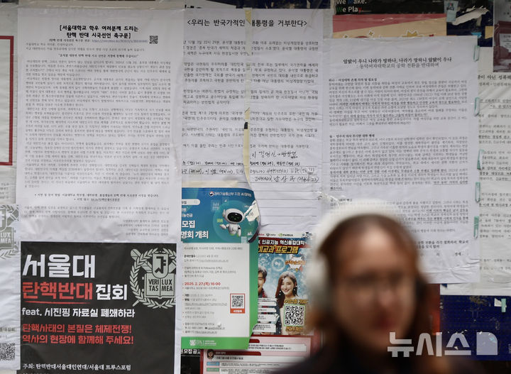 [서울=뉴시스] 김명년 기자 = 16일 오후 서울 관악구 서울대학교 중앙도서관 앞 게시판에 윤석열 대통령에 대한 탄핵 찬성 및 반대 대자보가 게시돼 있다. 2025.02.16. [email protected]