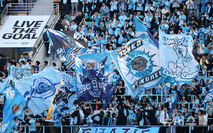 [대구=뉴시스] 이무열 기자 = 16일 대구 북구 대구iM뱅크PARK에서 열린 하나은행 K리그1 2025 1라운드 대구FC와 강원FC의 경기에서 대구FC 서포터스가 응원전을 펼치고 있다. 2025.02.16. [email protected]