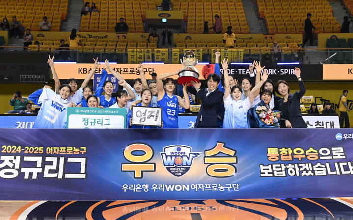 [서울=뉴시스] 홍효식 기자 = 16일 청주체육관에서 열린 2024-2025 여자프로농구 정규리그 원정 경기에서 청주 KB스타즈를 46-44로 이긴 우리은행 김단비와 위성우 감독이 트로피를 들어올리고 있다. (사진=WKBL 제공) 2025.02.16. [email protected] *재판매 및 DB 금지