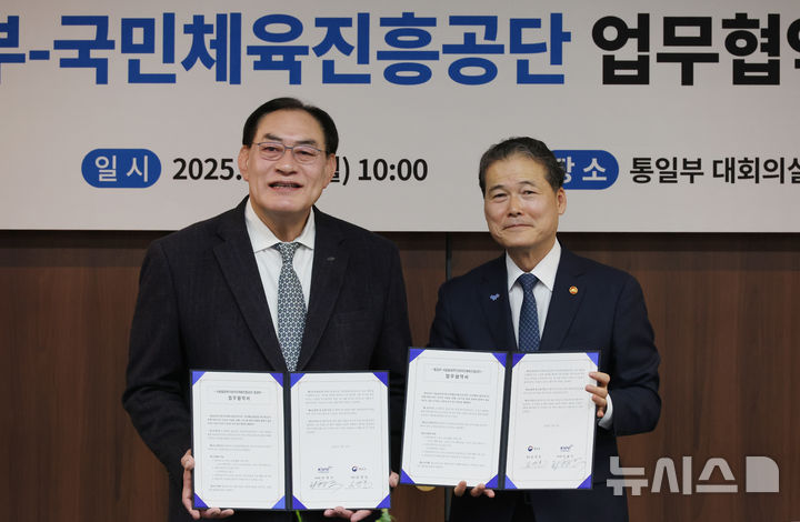 [서울=뉴시스] 김명원 기자 = 김영호(오른쪽) 통일부 장관과 하형주 서울올림픽기념국민체육진흥공단 이사장이 17일 오전 서울 종로구 정부서울청사에서 북한이탈주민 건강증진 및 정착지원을 위한 통일부-국민체육진흥공단 업무협약 체결식을 하고 있다. 2025.02.17. [email protected]