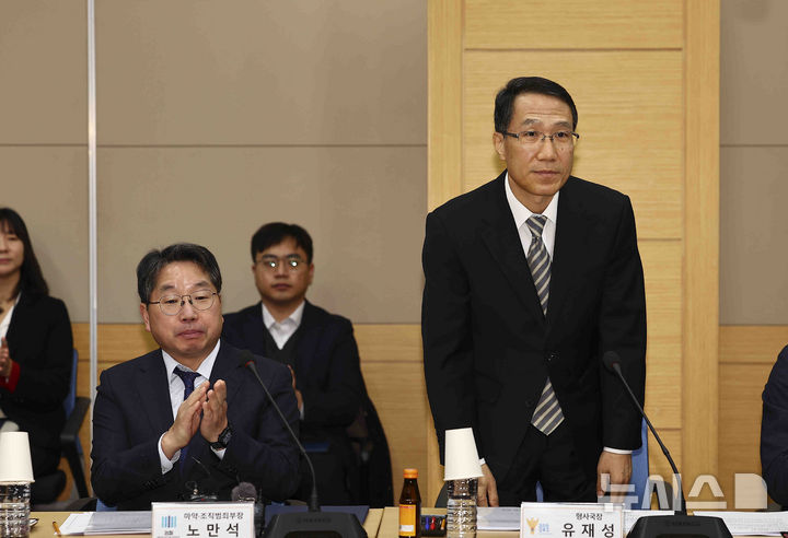 [서울=뉴시스] 김근수 기자 = 노만석(왼쪽) 대검찰청 마약 조직범죄부장과 유재성 경찰청 국가수사본부 형사국장이 17일 서울 서초구 대검찰청 국가디지털포렌식센터(NDFC)에서 열린 제5차 마약범죄 특별수사본부 회의에서 인사를 나누고 있다. 2025.02.17. [email protected]