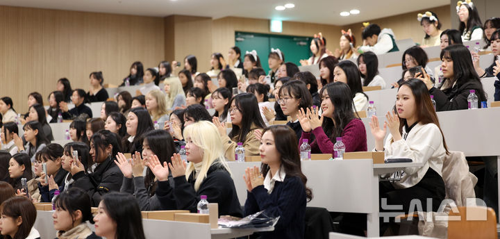 [서울=뉴시스] 김선웅 기자 = 17일 서울 서대문구 이화여자대학교에서 열린 인문과학대학 신입생 오리엔테이션(OT)에 참석한 예비 이화여대 학생들이 학교생활 관련 설명을 듣고 있다. 2025.02.17. [email protected]