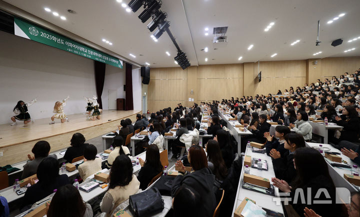 [서울=뉴시스] 김선웅 기자 = 17일 서울 서대문구 이화여자대학교에서 열린 인문과학대학 신입생 오리엔테이션(OT)에 참석한 예비 이화여대 학생들이 응원단 공연을 보며 박수를 치고 있다. 2025.02.17. [email protected]