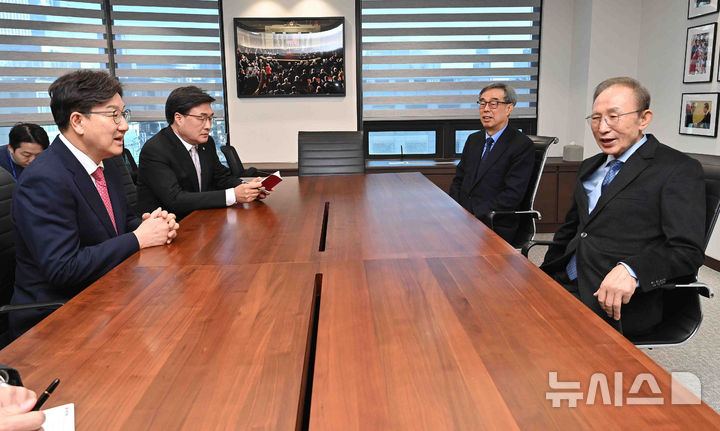 [서울=뉴시스] 김근수 기자 = 권성동 국민의힘 원내대표가 17일 오전 서울 서초구 이명박재단 사무실을 찾아 이명박 전 대통령과 대화를 하고 있다. (공동취재) 2025.02.17. [email protected]