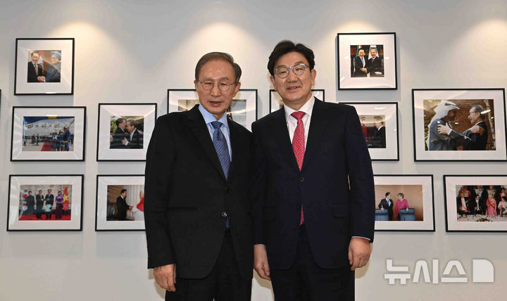 [서울=뉴시스] 김근수 기자 = 권성동 국민의힘 원내대표가 17일 오전 서울 서초구 이명박재단 사무실을 찾아 이명박 전 대통령과 기념촬영하고 있다. (공동취재) 2025.02.17. [email protected]