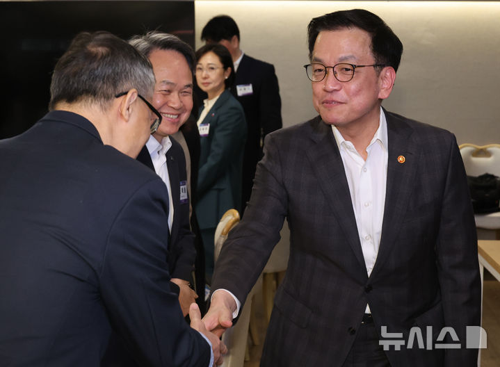 간담회 참석자들과 인사하는 최상목 대통령 권한대행