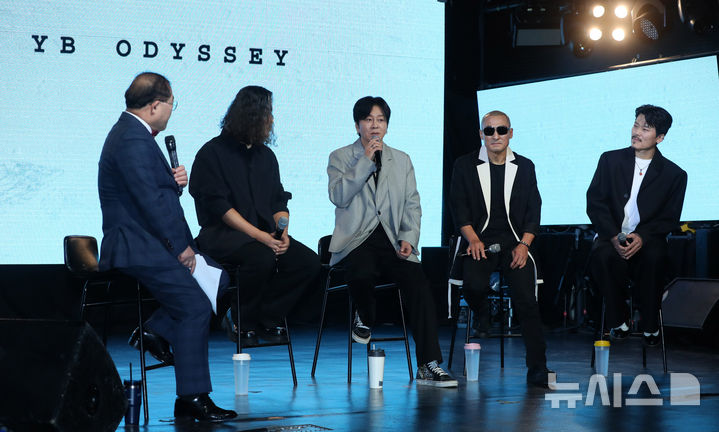 [서울=뉴시스] 김혜진 기자 = YB 윤도현(왼쪽 세번째)이 17일 오후 서울 마포구 롤링홀에서 열린 새 앨범 '오디세이'(Odyssey) 발매 기념 쇼케이스에서 앫범과 관련된 다양한 이야기를 나누고 있다.