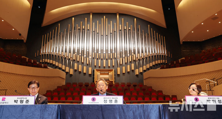 [부산=뉴시스] 하경민 기자 = 박형준(맨 왼쪽부터) 부산시장과 정명훈 클래식부산 예술감독, 박민정 클래식부산 대표가 17일 부산 부산진구 부산콘서트홀 대공연장에서 열린 기자간담회에 참석해 부산콘서트홀 개관 페스티벌 프로그램, 기획공연 등에 대해 설명하고 있다.