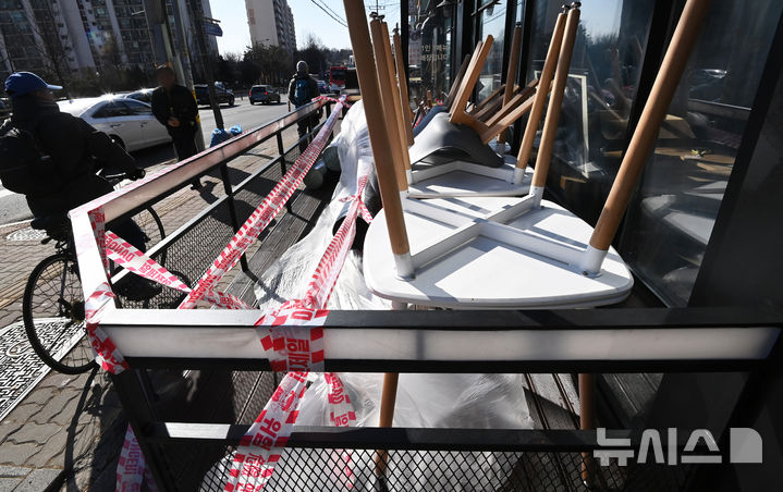 [수원=뉴시스] 김종택 기자 = 경기 침체와 계엄 등의 영향으로 인해 작년 4분기 카페 및 술집을 운영하는 소상공인이 가장 큰 타격을 받은 것으로 나타난 17일 경기도 수원시 한 폐업한 카페 매장 앞에 테이블과 의자 등이 쌓여 있다. 2025.02.17. [email protected]