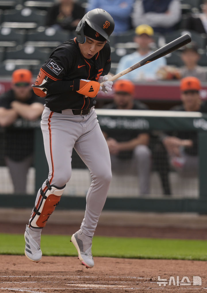 [스코츠데일=AP/뉴시스] 샌프란시스코 자이언츠의 이정후가 17일(현지 시간) 미 애리조나주 스코츠데일 스타디움에서 열리고 있는 스프링캠프 첫 라이브 타격 연습(BP) 중 투수의 몸쪽 공을 간신히 피하고 있다. 2025.02.18.