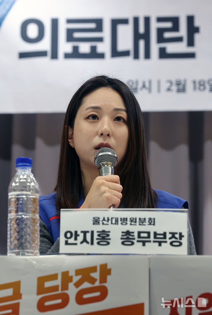 [서울=뉴시스] 김금보 기자 = 조중래 의료연대본부 경북대병원분회장이 18일 오전 서울 종로구 서울대병원 암병원 지하 1층 서성환홀에서 열린 '의료대란 1년 병원 현장 어떨게 변했나, 병원노동자 설문조사 결과공개 및 현장증언 기자간담회'에서 현장증언을 하고 있다. 의료연대본부는 이날 간담회를 통해 의료공공성 강화와 공공병원 확충, 공공의사 충원 등 제도 개선을 촉구했다. 2025.02.18. [email protected]