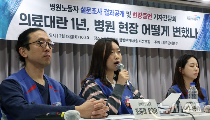 [서울=뉴시스] 김금보 기자 = 조중래 의료연대본부 경북대병원분회장이 18일 오전 서울 종로구 서울대병원 암병원 지하 1층 서성환홀에서 열린 '의료대란 1년 병원 현장 어떨게 변했나, 병원노동자 설문조사 결과공개 및 현장증언 기자간담회'에서 현장증언을 하고 있다. 의료연대본부는 이날 간담회를 통해 의료공공성 강화와 공공병원 확충, 공공의사 충원 등 제도 개선을 촉구했다. 2025.02.18. [email protected]