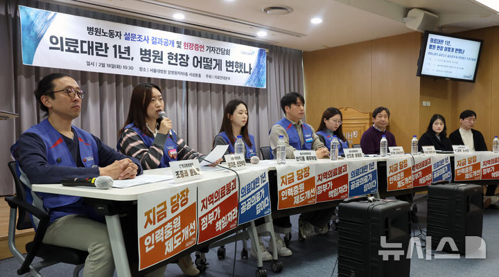 [서울=뉴시스] 김금보 기자 = 권지은 의료연대본부 서울대병원분회 선전부장이 18일 오전 서울 종로구 서울대병원 암병원 지하 1층 서성환홀에서 열린 '의료대란 1년 병원 현장 어떨게 변했나, 병원노동자 설문조사 결과공개 및 현장증언 기자간담회'에서 현장증언을 하고 있다. 의료연대본부는 이날 간담회를 통해 의료공공성 강화와 공공병원 확충, 공공의사 충원 등 제도 개선을 촉구했다. 2025.02.18. [email protected]