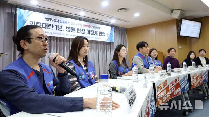 [서울=뉴시스] 김금보 기자 = 조중래 의료연대본부 경북대병원분회장이 18일 오전 서울 종로구 서울대병원 암병원 지하 1층 서성환홀에서 열린 '의료대란 1년 병원 현장 어떨게 변했나, 병원노동자 설문조사 결과공개 및 현장증언 기자간담회'에서 현장증언을 하고 있다. 의료연대본부는 이날 간담회를 통해 의료공공성 강화와 공공병원 확충, 공공의사 충원 등 제도 개선을 촉구했다. 2025.02.18. [email protected]