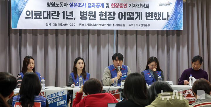 [서울=뉴시스] 김금보 기자 = 신동훈 의료연대본부 제주대병원분회장이 18일 오전 서울 종로구 서울대병원 암병원 지하 1층 서성환홀에서 열린 '의료대란 1년 병원 현장 어떨게 변했나, 병원노동자 설문조사 결과공개 및 현장증언 기자간담회'에서 현장증언을 하고 있다. 의료연대본부는 이날 간담회를 통해 의료공공성 강화와 공공병원 확충, 공공의사 충원 등 제도 개선을 촉구했다. 2025.02.18. [email protected]
