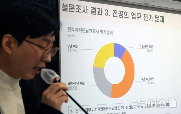 [서울=뉴시스] 김금보 기자 = 정성식 시민건강연구소 연구원이 18일 오전 서울 종로구 서울대병원 암병원 지하 1층 서성환홀에서 열린 '의료대란 1년 병원 현장 어떨게 변했나, 병원노동자 설문조사 결과공개 및 현장증언 기자간담회'에서 실태조사 결과 발표를 하고 있다. 의료연대본부는 이날 간담회를 통해 의료공공성 강화와 공공병원 확충, 공공의사 충원 등 제도 개선을 촉구했다. 2025.02.18. [email protected]