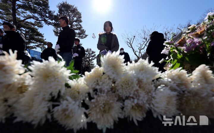[대구=뉴시스] 이무열 기자 = 18일 대구 동구 시민안전테마파크에서 열린 대구지하철 화재참사 22주기 추모식에서 유가족들이 헌화하고 있다. 2025.02.18. [email protected]