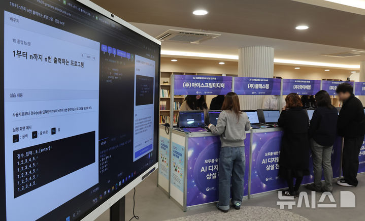 [부산=뉴시스] 하경민 기자 = 올해 3월 도입을 앞둔 'AI 디지털교과서 상설 전시회'가 열린 18일 부산 북구 SW·AI교육거점센터에서 지역 교사들이 AI 디지털교과서를 살펴보고 있다.