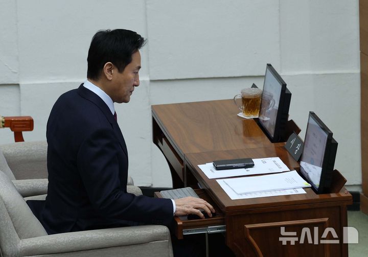 [서울=뉴시스] 고범준 기자 = 오세훈 서울시장이 18일 서울 중구 서울특별시의회에서 열린 제328회 임시회 제1차 본회의에서 자료를 살펴보고 있다. 2025.02.18. [email protected]
