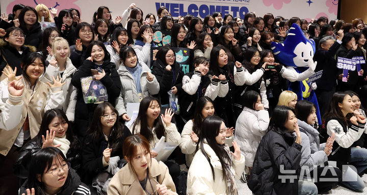 [서울=뉴시스] 추상철 기자 = 18일 오후 서울 용산구 숙명여자대학교에서 열린 '25학번 새내기를 위한 이색 오리엔테이션'에서 25학번 새내기들이 재학생과 함께 기념촬영을 하고 있다.