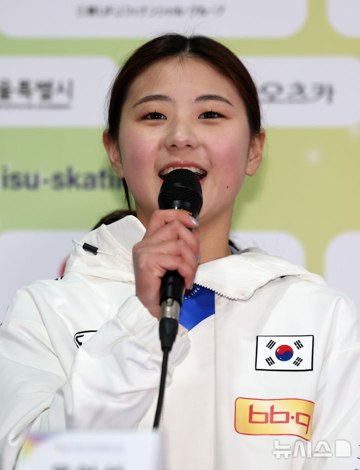 [서울=뉴시스] 이영환 기자 = 18일 서울 양천구 목동아이스링크 프레스센터에서 열린 2025 ISU 사대륙 피겨스케이팅 선수권대회 미디어데이에서 윤아선이 소감을 전하고 있다. 2025.02.18. [email protected]