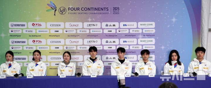 [서울=뉴시스] 이영환 기자 = 이해인(왼쪽부터), 윤아선, 김채연, 차준환, 이시형, 김현겸, 임해나, 권예가 18일 서울 양천구 목동아이스링크 프레스센터에서 열린 2025 ISU 사대륙 피겨스케이팅 선수권대회 미디어데이에 참석하고 있다. 2025.02.18. [email protected]