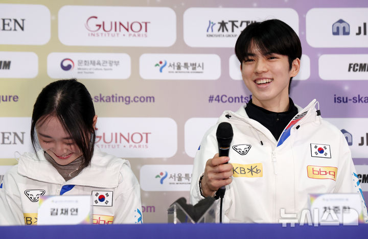 [서울=뉴시스] 이영환 기자 = 차준환과 김채연이 18일 서울 양천구 목동아이스링크 프레스센터에서 열린 2025 ISU 사대륙 피겨스케이팅 선수권대회 미디어데이에서 취재진의 질문에 활짝 웃고 있다. 2025.02.18. [email protected]