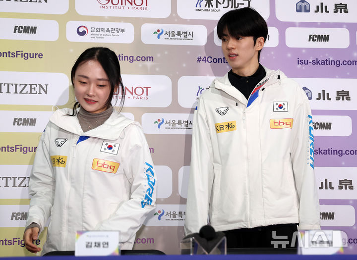 [서울=뉴시스] 이영환 기자 = 차준환과 김채연이 18일 서울 양천구 목동아이스링크 프레스센터에서 열린 2025 ISU 사대륙 피겨스케이팅 선수권대회 미디어데이에 참석하고 있다. 2025.02.18. [email protected]