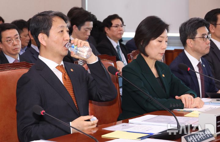 [서울=뉴시스] 조성봉 기자= 안덕근 산업통상자원부 장관이 19일 오전 서울 여의도 국회에서 열린 산업통상자원중소벤처기업위원회 전체회의에서 물을 마시고 있다. 2025.02.19. [email protected]