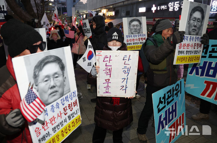 [서울=뉴시스] 김진아 기자 = 윤석열 대통령 지지자들이 19일 서울 종로구 문형배 헌법재판소장 권한대행의 자택 앞에서 재판관 사퇴를 촉구하는 집회를 하고 있다. 2025.02.19. [email protected]