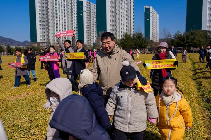 [증평=뉴시스] 20일 충북 증평군 증평읍 송산리에서 이재영(가운데) 군수와 초등학생들이 송산초등학교 신설을 기원하는 청보리밟기 행사를 진행하고 있다. (사진=증평군 제공) 2025.2.20. [email protected]