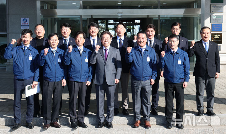 [아산=뉴시스] 권창회 기자 = 이재명 더불어민주당 대표가 20일 오전 충남 아산시 현대자동차 아산공장을 방문해 이동석 현대자동차 사장을 비롯한 임원진, 의원들과 기념촬영을 하고 있다. 2025.02.20. [email protected]